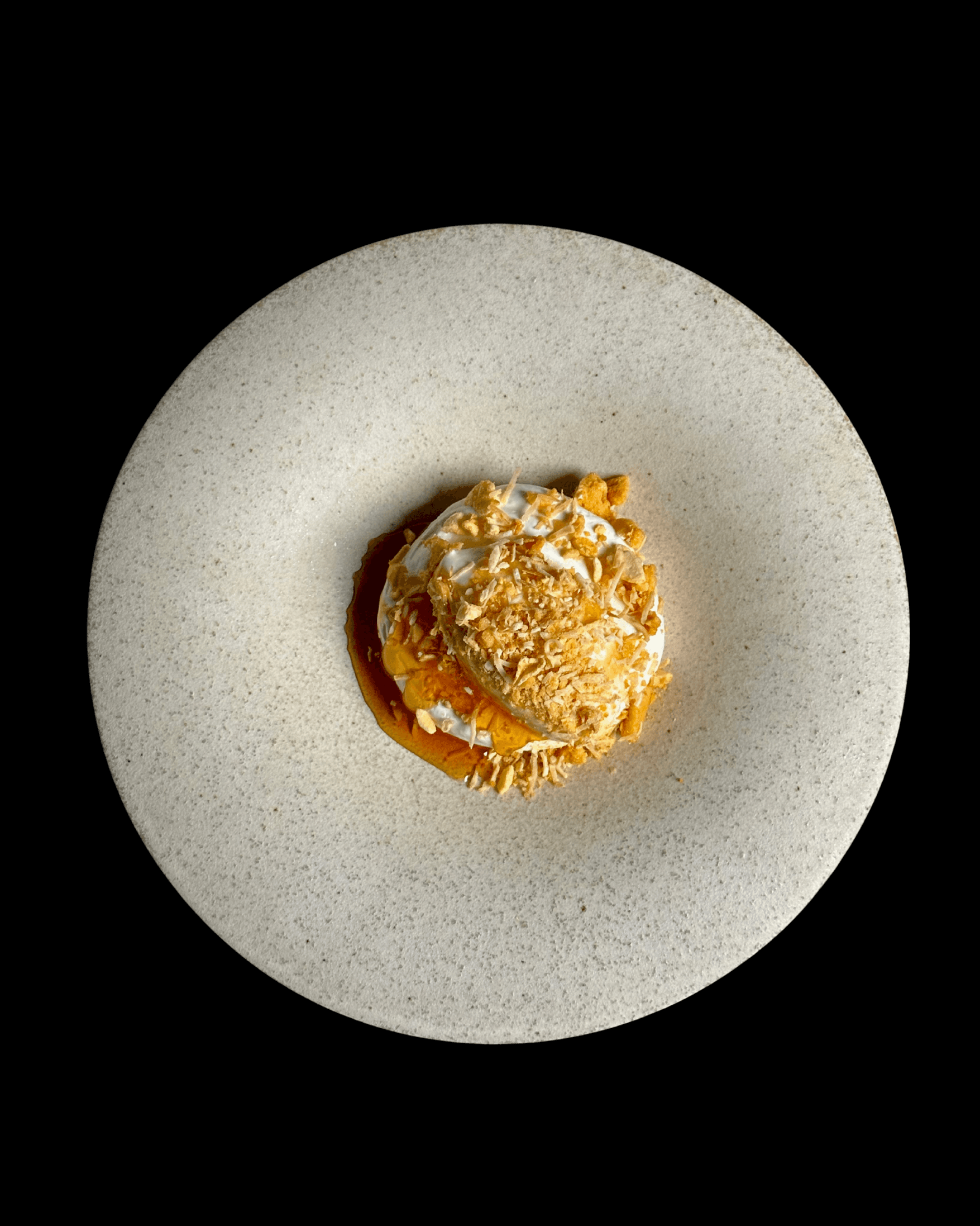 Sour meringue, mango crème pâtissière, puffed rice, mango jelly, roasted rice ice-cream